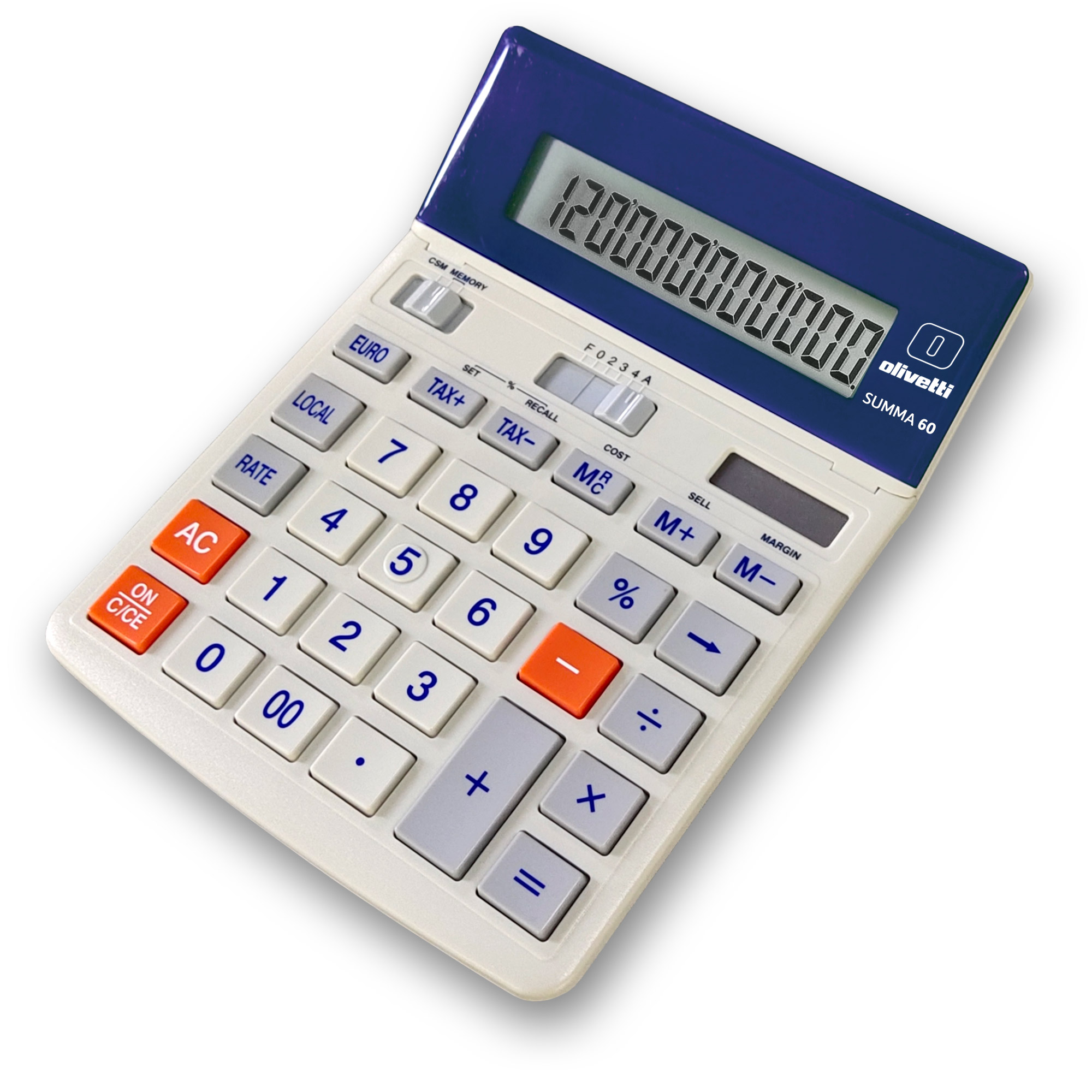 Desk calculator, designed for semi-professional use, with a two-colour impact printer. It comes with an ample ergonomic keypad, with soft keys, differently coloured according to the different calculation functions.